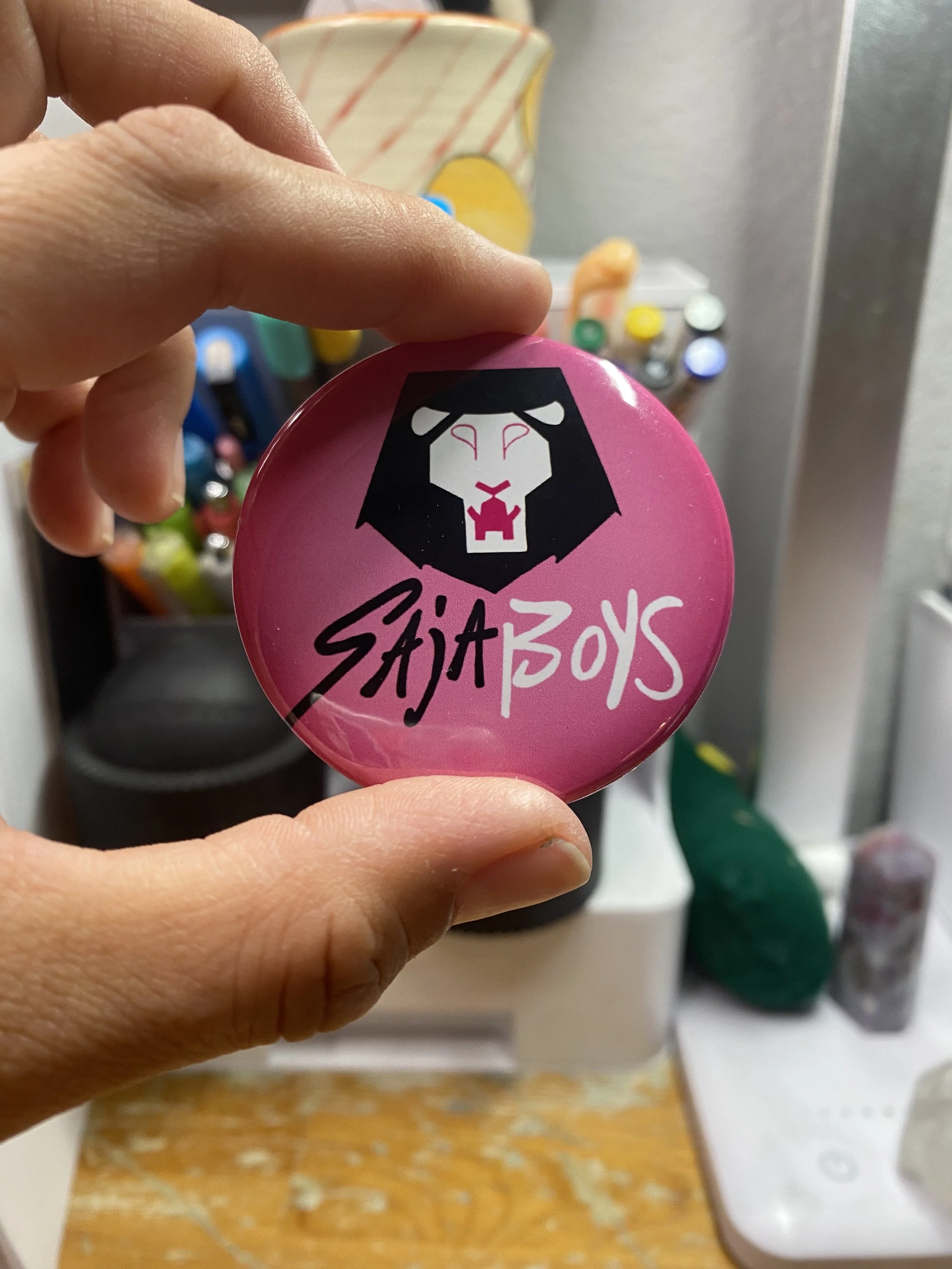 Inspired by the energetic world of K-Pop Demon Hunters, this button proudly displays your love and admiration for the fierce girls or the handsome boys! Buy your favorite team, or buy both!